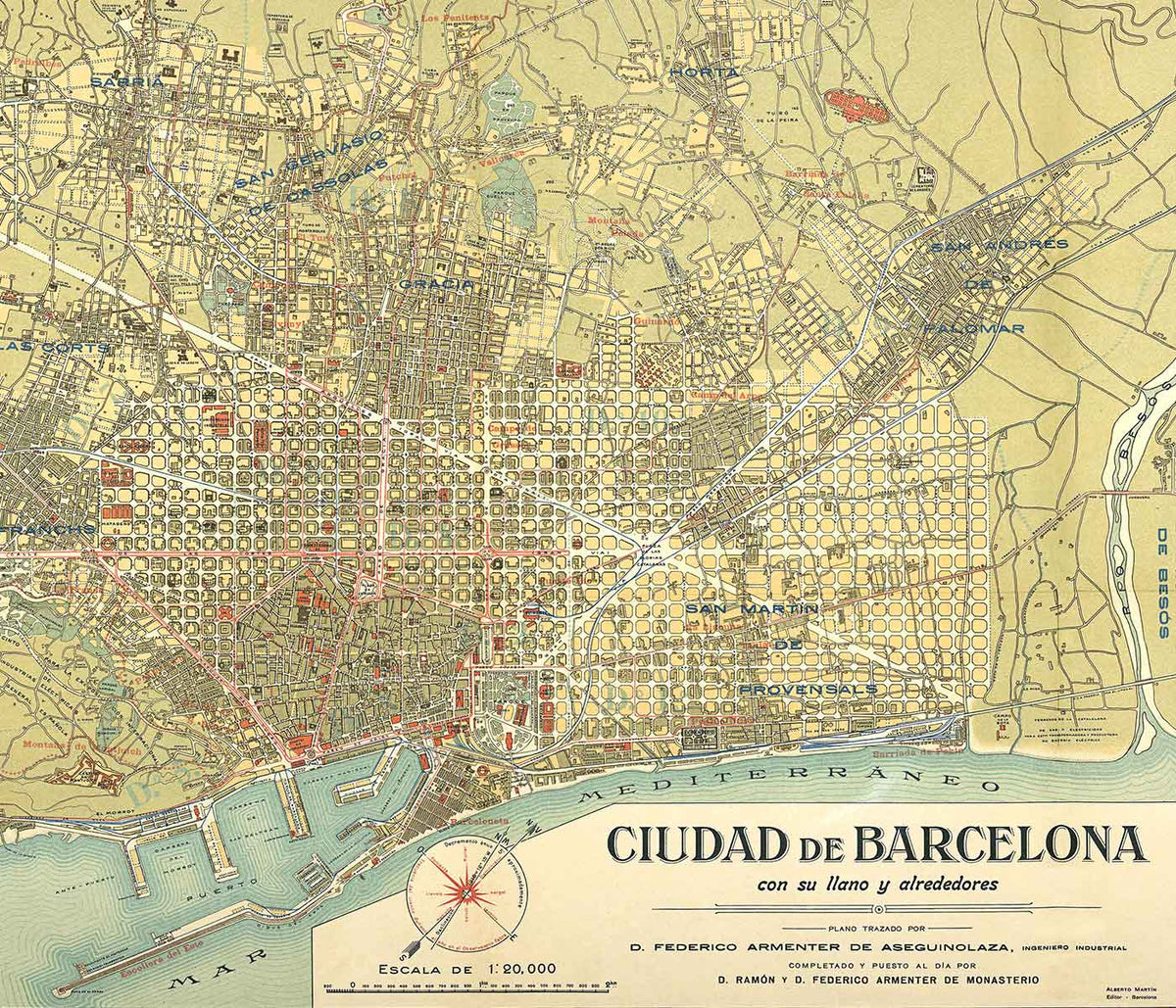 Unknown artist · 1992 · High-contrast aerial Barceloneta poster balancing tight city grids with open Mediterranean water