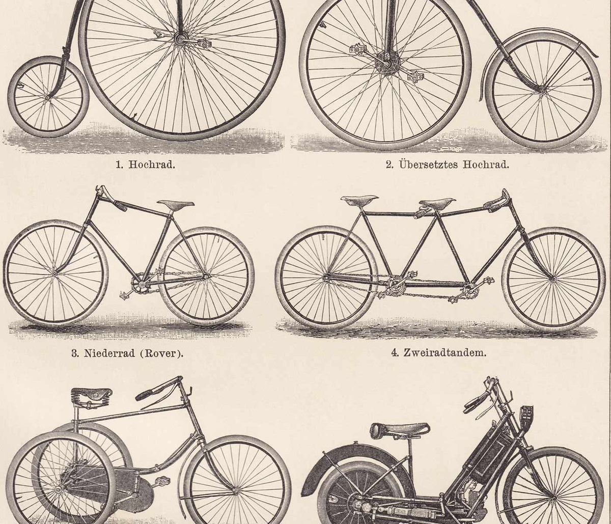 Meyers Konversations Lexikon · 1894 · Detailed bicycle vintage print presenting late 19th century frame designs in crisp black linework