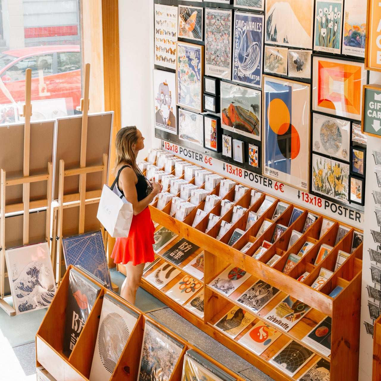 To harmonize the space, echo the blue tones with textiles or accessories, and incorporate red and pink elements through rugs or ceramics. A simple dark frame from our frames collection highlights the poster's graphic qualities and anchors it within a gallery wall arrangement.